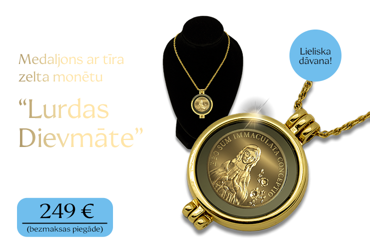 Ar prieku piedāvājam Jums apzeltītu medaljonu ar tīra zelta monētu, uz kuras attēlota Lurdas Jaunava Marija.