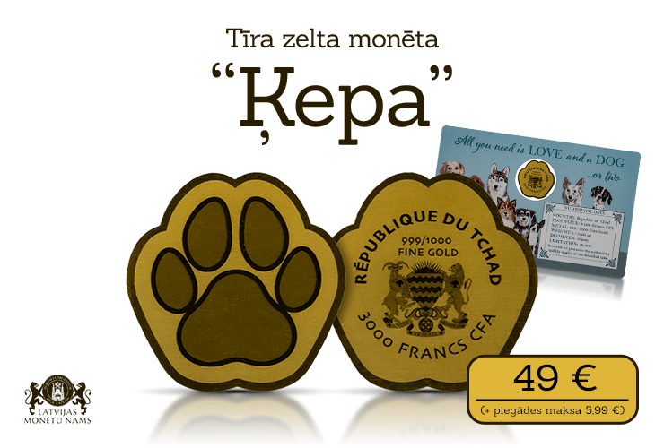 Jā, es pasūtu zelta monētu „Ķepa” par 49 € (+ piegādes maksa 5,99 €). Par sūtījumu samaksāšu norādītajā pasta nodaļā.