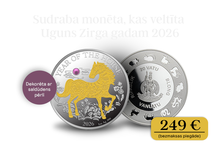Jā, es pasūtu sudraba monēta, kas veltīta Uguns Zirga gadam 2026 par 249 € (bezmaksas piegāde). Par sūtījumu samaksāšu norādītajā pasta nodaļā.
